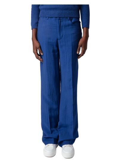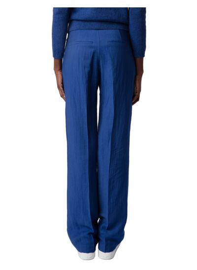 Pantalon évasé en lin texturé bleu Deep Sea pour femme. Plis sur la longueur. Cinq poches fonctionnelles et passants pour ceinture à la taille. Composition 100% lin. Fabrication portugaise. Marque Zadig&Voltaire.