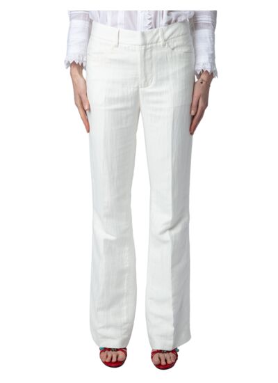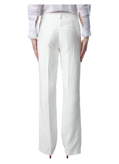 100% lin texturé blanc. Coupe évasée avec plis sur la longueur. Cinq poches fonctionnelles. Passants pour ceinture à la taille. Fabriqué au Portugal.