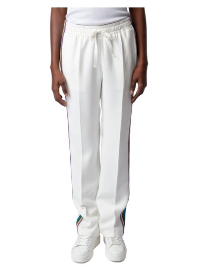 Confectionné en crêpe fluide, ce pantalon signé Zadig&Voltaire se distingue par sa coupe décontractée et ses cordons de serrage ajustables à la taille, offrant une silhouette moderne et personnalisable. Les bandes pailletées apportent une touche d’éclat subtile, idéale pour dynamiser vos tenues quotidiennes ou vos looks de soirée.
