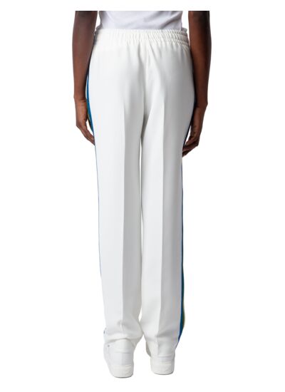Le pantalon POMY CREPE impose son allure minimaliste et sophistiquée avec ses bandes latérales pailletées qui captent la lumière à chaque mouvement. Une pièce blanche éclatante, pensée pour allier confort et style urbain.