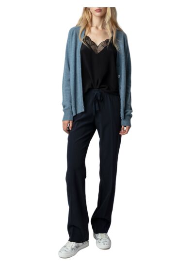 Conçu pour allier confort et modernité, ce pantalon signé Zadig&Voltaire se distingue par sa coupe fluide et son tissu en crêpe léger qui épouse délicatement la silhouette. Le cordon à la taille permet un ajustement personnalisé, tandis que les poches latérales ajoutent une touche pratique sans sacrifier l’esthétique. Idéal pour passer de la journée au soir avec une aisance naturelle.