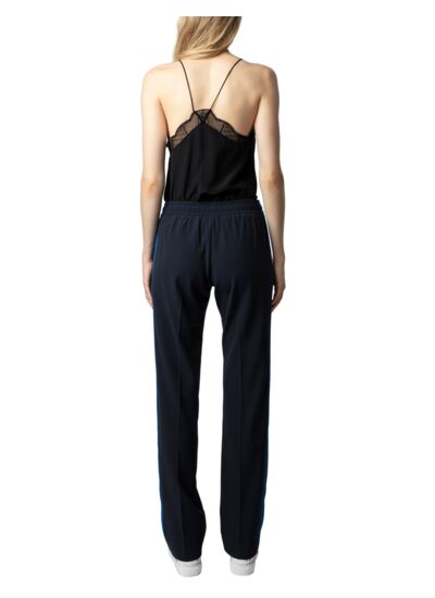 Affirmez votre style avec ce pantalon fluide en crêpe bleu marine, sublimé par des bandes latérales glitter qui captent la lumière à chaque mouvement. Une pièce audacieuse et élégante, parfaite pour dynamiser vos looks du quotidien.