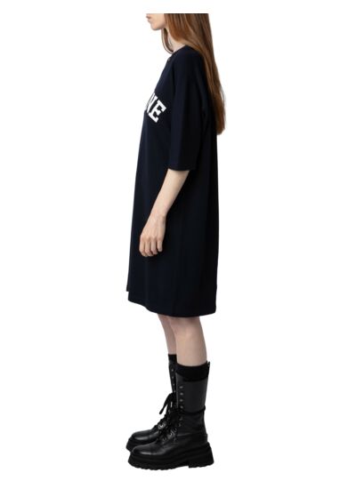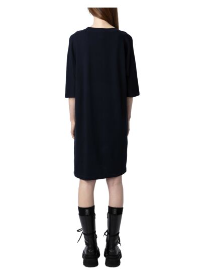 Robe t-shirt bleu encre marine pour femme, imprimés "Imagine" et ailes à l’avant, col rond, manches 3/4 kimono. Composition 100 % coton. Marque Zadig&Voltaire.