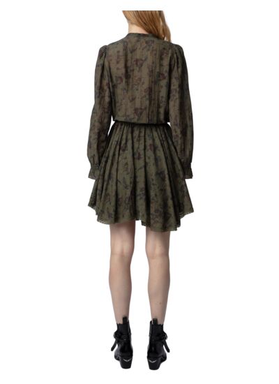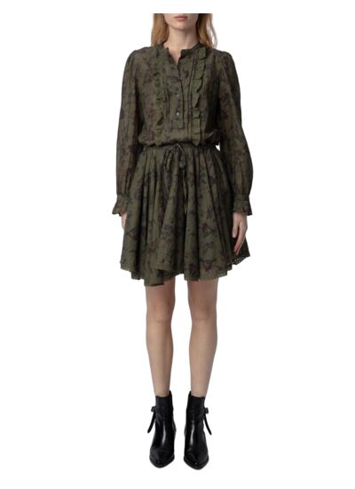 100 % coton, cette robe courte en kaki est signée Zadig&Voltaire. Elle présente un col rond, une fermeture boutonnée, des fronces et plis à la taille avec un nouage, une jupe volantée à bords en dentelle, ainsi que des manches longues avec poignets boutonnés.