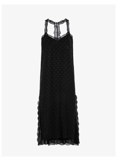 100% soie. Robe longue esprit lingerie noire pour femme. Jacquard ailes et finitions en dentelle française exclusive Sophie Hallette. Décolleté plongeant, bretelles larges non réglables. Dos nageur avec bandes en dentelle. Jupe évasée avec fentes sur les côtés. Marque : Zadig&Voltaire.