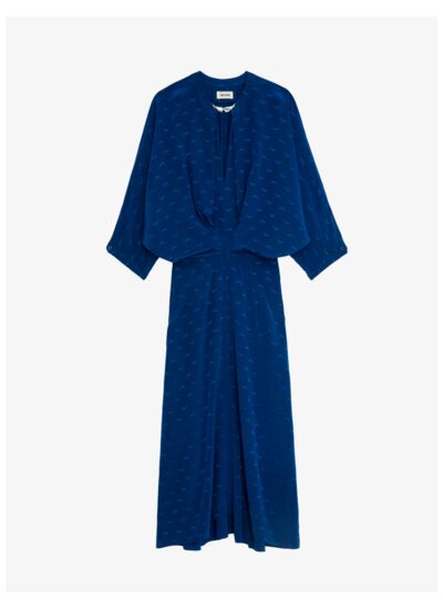 Robe mi-longue en soie bleu Oversease pour femme, jacquard ailes. Col rond à découpe en V avec fermoir métallique ailes à crochet. Fermeture zippée au dos. Manches 3/4 chauve-souris avec poignets boutonnés. Taille froncée et cintrée. Jupe asymétrique courte à l’avant. Composition : 100% soie. Marque : Zadig&Voltaire.