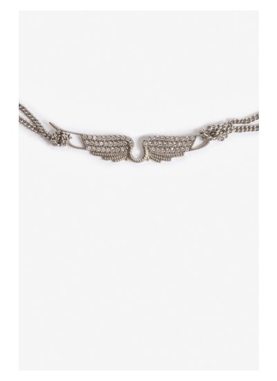 Affirmez votre style avec ce collier court à double chaîne, alliant audace et élégance. Le pendentif ailes serti de cristaux blancs capte la lumière pour sublimer chaque tenue.