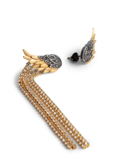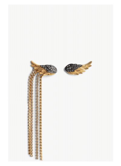 Composition : laiton doré et noirci, serti de cristaux. La ligne de bijoux est fabriquée à partir de 80 % de laiton recyclé, à l’exception des chainettes. Marque : Zadig&Voltaire.