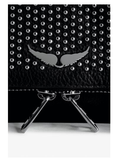 Cuir grainé noir, clous plumetis, doublure coton noir, deux chaînes amovibles (cuir/métal), ailes ornées de strass, rabat zippé et aimanté, poches zippées arrière et intérieure. Dimensions adaptées pour un téléphone portable jusqu’à 6,1 pouces.