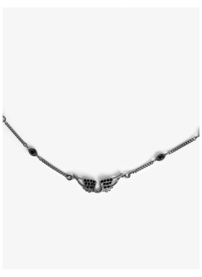 Collier en laiton gris avec pendentif ailes orné de cristaux. Fermoir ajustable pour un porté confortable. La chaîne est composée à 80% de laiton recyclé, garantissant durabilité et respect de l’environnement. Marque : Zadig&Voltaire.