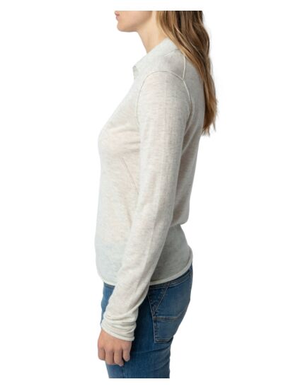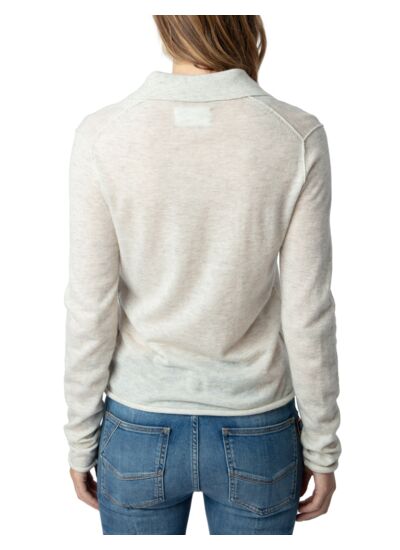 100% cachemire plume, ce pull est issu d’un tricotage fin et soigné. Il présente un col polo en V, un plastron strassé à l’avant, des manches longues, des bords roulottés et la signature ZV pointelle au bas. Couleur : gris Neige. Marque : Zadig&Voltaire.
