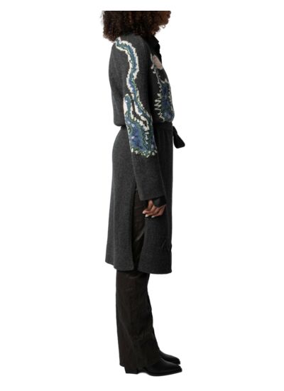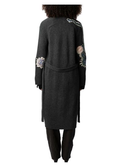 Manteau long en 100 % laine mérinos gris foncé Charcoal. Intarsia jacquard et broderies fleuries à l’avant et aux manches. Ceinture amovible à nouer. Manches longues évasées. Bords côtelés. Marque : Zadig&Voltaire.