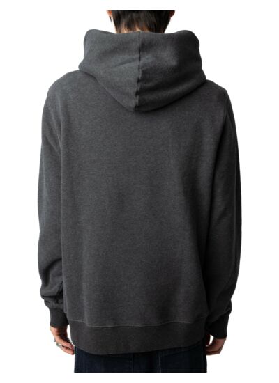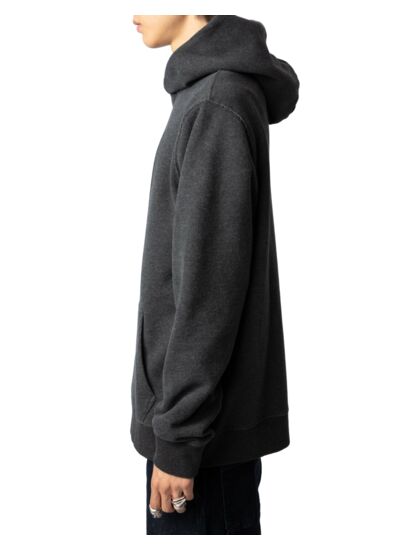 Sweatshirt gris anthracite pour homme, imprimé photoprint Cosmic à l’avant, capuche ajustable, poche kangourou, manches longues avec bords côtelés. Composition 100 % coton. Modèle fabriqué au Portugal. Marque Zadig&Voltaire.