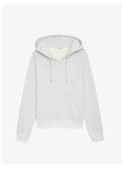 Composition 100 % coton. Sweatshirt gris chiné clair avec capuche à cordons, poche kangourou, manches longues et bords côtelés. Modèle fabriqué au Portugal par Zadig&Voltaire.
