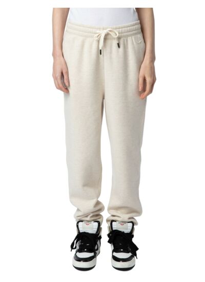 Pantalon de jogging beige en coton, cordon de serrage à la taille, deux poches latérales, une poche plaquée au dos, chevilles resserrées, broderie ailes contrastées à l’avant. Marque : Zadig&Voltaire.