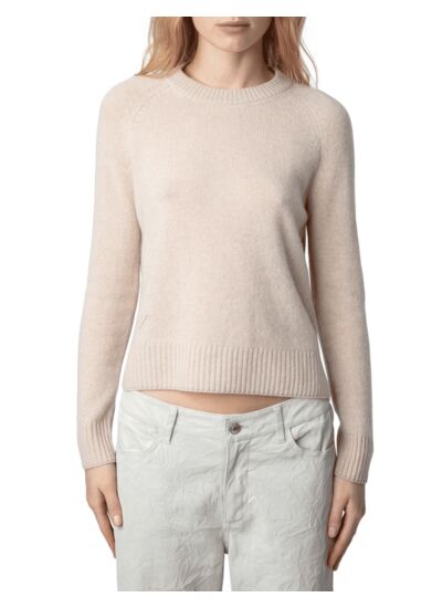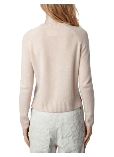 100 % cachemire. Col rond. Manches longues. Détails en pointelle ZV sur le corps. Bords côtelés aux poignets et à la base. Couleur beige naturel. Marque Zadig&Voltaire.