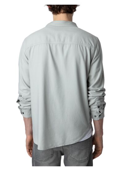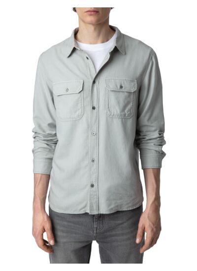Chemise Oyster grise homme, col chemise, fermeture boutonnée, 2 poches poitrine à rabat boutonné, manches longues, poignets boutonnés. Modèle fabriqué au Portugal. Composition : coton et viscose. Marque : Zadig&Voltaire.