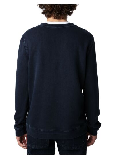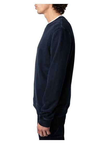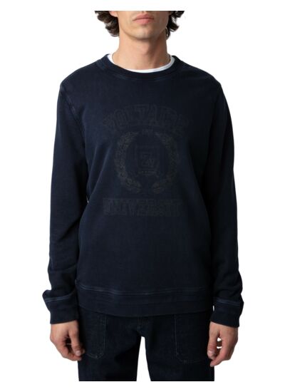 100 % coton biologique molletonné flammé, effet délavé bleu marine encre, col rond, manches longues, bords côtelés chevrons. Imprimé blason Zadig&Voltaire University à l’avant. Marque : Zadig&Voltaire.