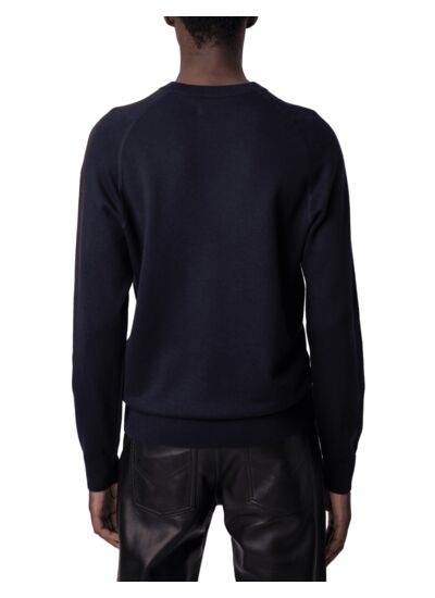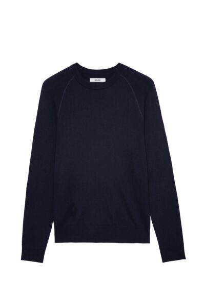 100% coton. Col rond, manches longues, bords côtelés. Broderie ZV ton sur ton au bas. Couleur encre bleu marine. Marque Zadig&Voltaire.