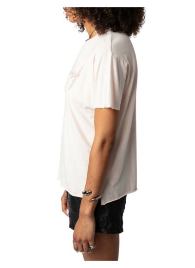 100% coton biologique. Col rond côtelé. Manches courtes avec bords bruts. Message flocké "Love Yourself" orné de strass à l’avant. Coupe large. Couleur rose pâle Sweet. Marque Zadig&Voltaire.