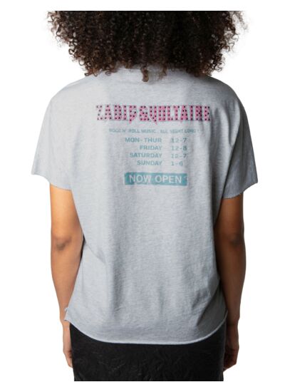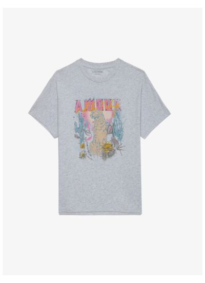 100% coton biologique gris chiné. Col rond côtelé. Manches courtes avec bords bruts. Imprimés effet usé à l’avant et au dos. Coupe large. Fabriqué au Portugal. Marque : Zadig&Voltaire.