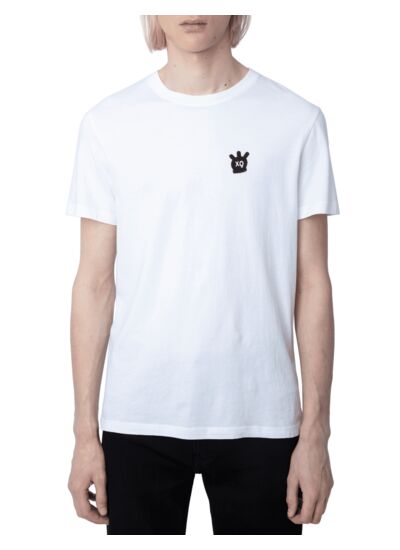100% coton, ce T-shirt blanc présente un patch Skull XO brodé sur la poitrine. Il appartient à la catégorie Jersey, offrant une texture souple et résistante. Marque : Zadig&Voltaire.