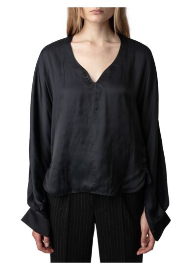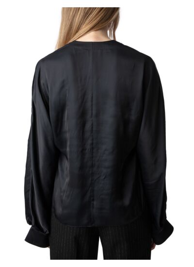 Blouse ample en satin noir pour femme, col tunisien à cinq boutons, manches longues avec poignets resserrés. Composition 100 % polyester. Marque Zadig&Voltaire.