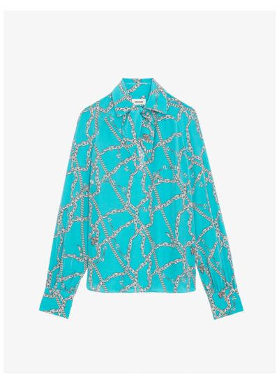 100% soie, signée Zadig&Voltaire. Lavage délicat recommandé. Manches longues avec poignets boutonnés. Col chemise ouvert en V avec lavallière amovible. Bas liquette avec découpes latérales. Motifs chaînes et signature ZV imprimés.