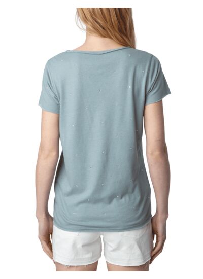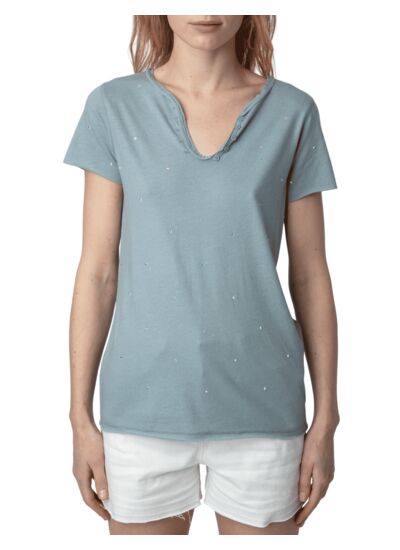 Ce t-shirt tunisien est en coton Glacier bleu clair, doté d’un col tunisien à cinq boutons, de manches courtes et orné de strass argentés. Il fait partie de la collection femme de la marque Zadig&Voltaire.