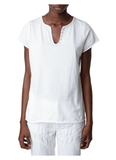 Confectionné en coton doux, ce modèle signé Zadig&Voltaire se distingue par son col tunisien à cinq boutons roses, un détail raffiné qui modernise la coupe classique. Les manches courtes et les bords bruts renforcent son allure casual-chic, idéale pour vos looks d’été ou layering léger. Fabriqué au Portugal, il garantit une qualité irréprochable et un confort durable.