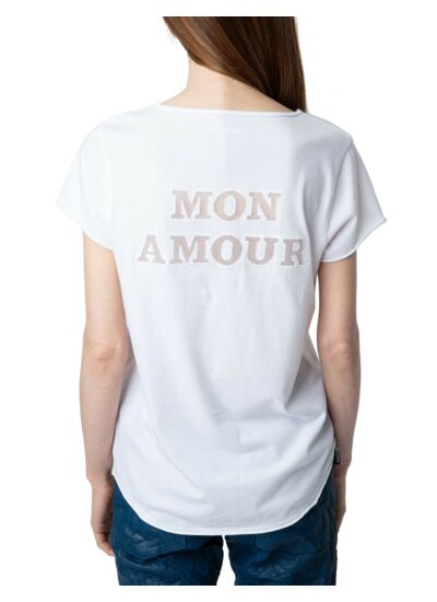 Fabriqué en coton biologique, ce t-shirt blanc pour femme présente un col tunisien en V avec cinq boutons, des manches courtes et des bords bruts. La broderie "Mon Amour" orne le dos, signature discrète de la marque Zadig&Voltaire.