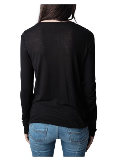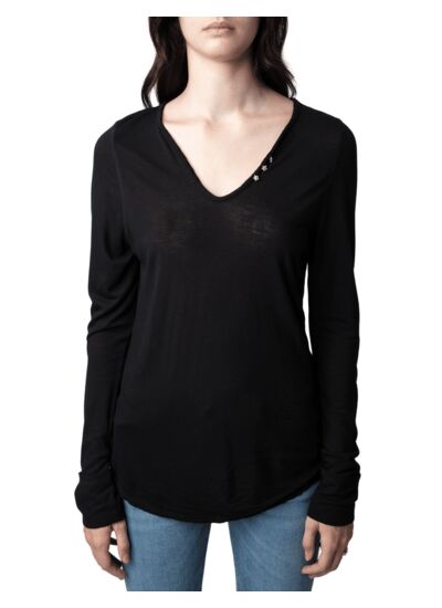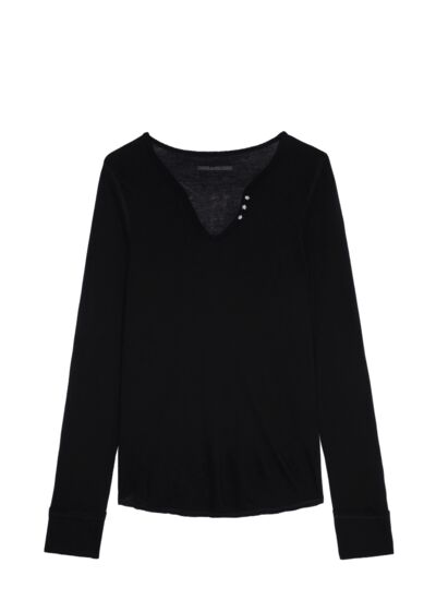 Le T-shirt noir Tunisie ML boutons bijoux incarne l’élégance discrète et le détail raffiné. Son col tunisien orné de trois boutons bijoux en forme d’étoiles apporte une touche unique à un basique revisité.