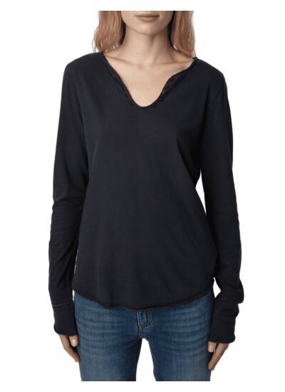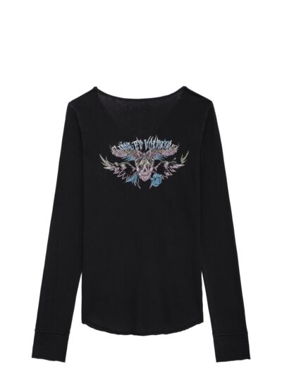 100% coton biologique, couleur carbone gris foncé, manches longues, col tunisien à 5 boutons, motifs Concert tête de mort et ailes au dos, bords bruts. Marque : Zadig&Voltaire.
