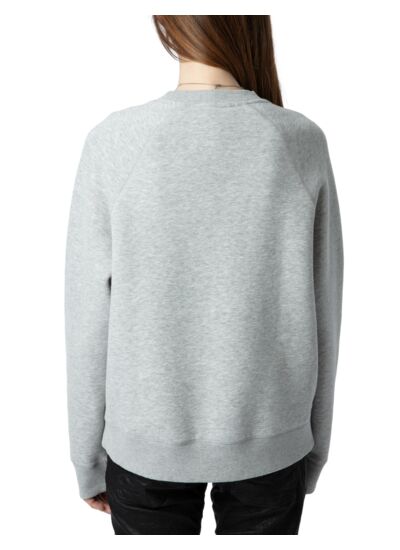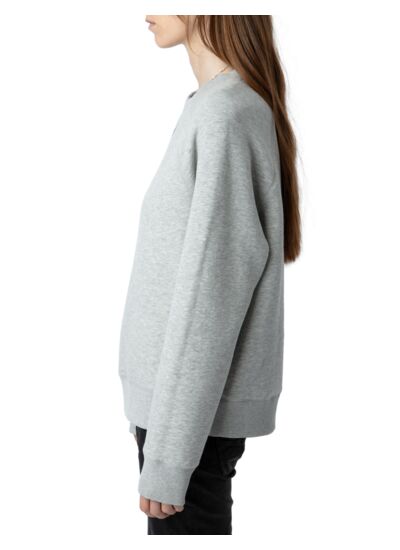 Sweatshirt en jersey gris chiné clair, manches longues, décor ailes ZV en strass sur l’avant. Composition 100 % coton. Marque Zadig&Voltaire.