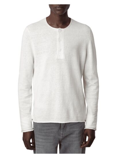 Confectionné dans un mélange lin et coton, ce pull léger offre une texture douce et respirante, idéale pour toutes les saisons. Son col rond à trois boutons apporte une touche d’originalité maîtrisée, tandis que les manches longues et la signature ZV pointelle soulignent un savoir-faire subtil et contemporain. Les bords francs renforcent son esprit casual chic, parfait pour un look soigné sans effort.