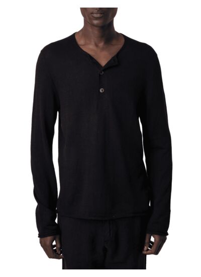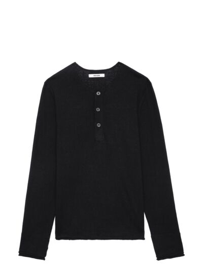 Composition : lin et coton. Col rond à trois boutons. Manches longues. Signature ZV pointelle et bords francs. Couleur : noir. Marque : Zadig&Voltaire.