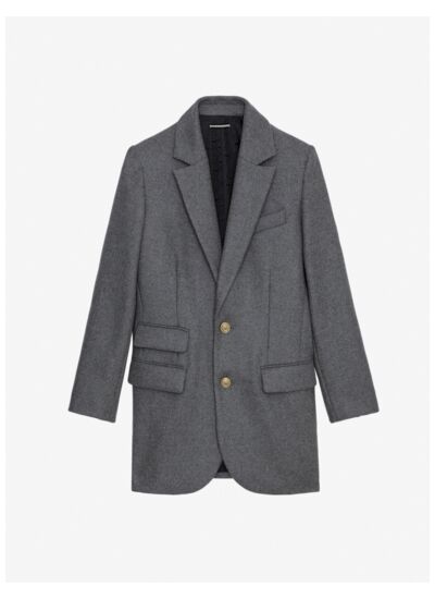 Manteau court droit en laine chinée grise Stone pour femme. Col tailleur, fermeture à trois boutons. Patch broderie ailes, fente au dos. Trois poches à rabat, une poche intérieure, une poche poitrine passepoilée en biais. Manches longues avec poignets cassés. Doublure satinée à jacquard signature. Composition : laine. Marque : Zadig&Voltaire.