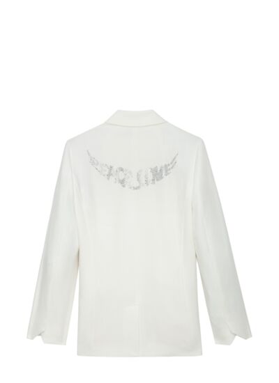 Affirmez votre style avec la veste blazer VISIT STRASS LOVE WINGS, une pièce audacieuse qui allie structure et féminité. Son motif ailes en strass au dos apporte une touche unique et lumineuse à votre silhouette.