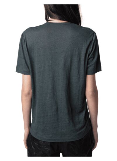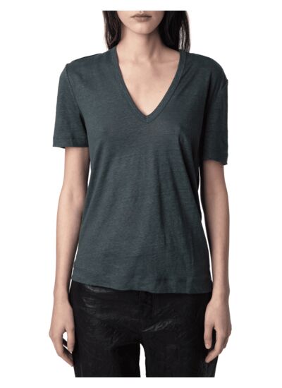T-shirt en lin biologique gris foncé Nori, col V, manches courtes. Composition : 100% lin. Marque : Zadig&Voltaire.