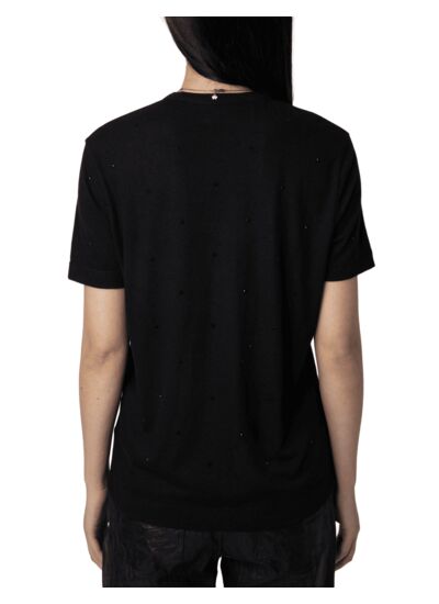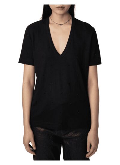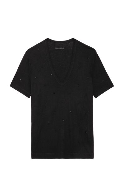 Composition 100 % polyester. T-shirt noir pour femme avec col V et manches courtes. Détails en strass argentés sur le devant. Marque Zadig&Voltaire. Catégorie Jersey.