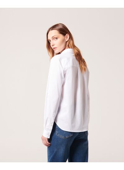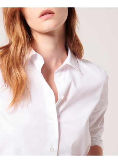 La chemise en popeline CARINE à la coupe droite est parée d'un coton blanc qui apporte fraîcheur à votre vestiaire de mi-saison. Dotée d'un col boutonné, elle se présente comme une chemise moderne, dans l'air du temps et qui se porte tout aussi bien fermée qu'ouverte par dessus un top pour un style plus décontracté.