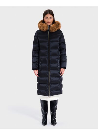 Dotée d'une capuche ornée de fausse fourrure et d'une coupe ajustée, elle offre une allure féminine et chic.