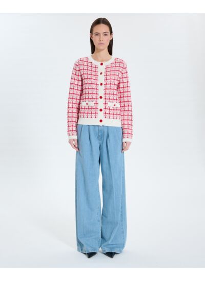 Gilet chic en maille façon tweed, rehaussé de finitions dorées.