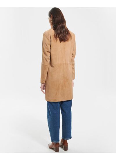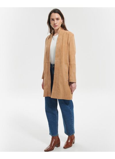 Manteau mi-long en suède, offrant à la fois style et confort, disponible dans un ton neutre et intemporel de beige.