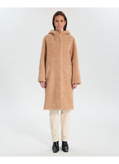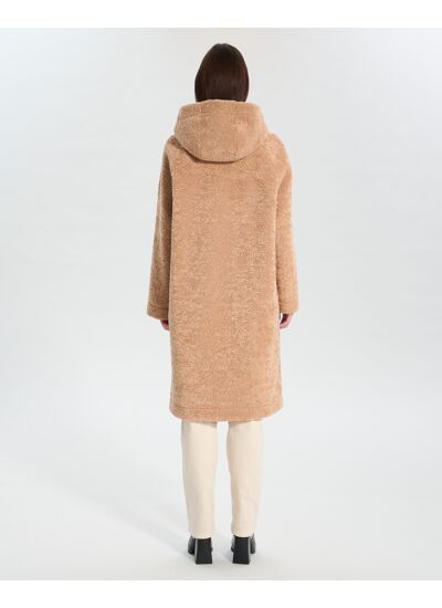 Manteau mi-long à la coupe droite et élégante, doté de fausse fourrure et d'une capuche intégrée.