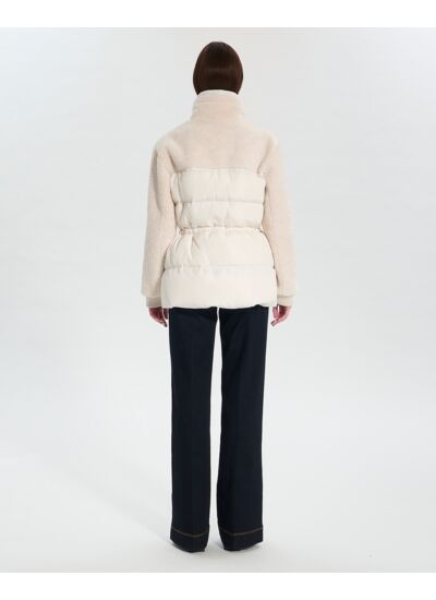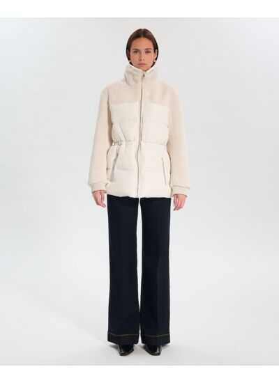 Ce manteau en fausse fourrure bi-matière se distingue par son col montant et sa coupe ajustée à la taille, mettant en valeur la silhouette.